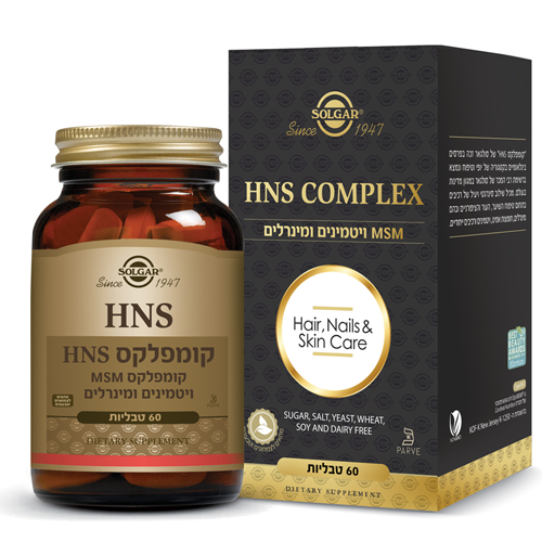 המוצר לטיפוח שכבש את העולם! נמכר ביותר מ-60 מדינות ומדורג בחמישייה הפותחת של מוצרי טיפוח עולמיים. HNS Complex מבית סולגאר מכיל שילוב יעיל של מינרלים, חומצות אמינו, ויטמין C ו-MSM. מקור ההפקה של מכלול הרכיבים ב- HNS Complex הינו טבעי בלבד ומיוצר באיכות גבוהה ללא פשרות. HNS Complex מסייע לטיפוח עור, שיער וציפורניים.