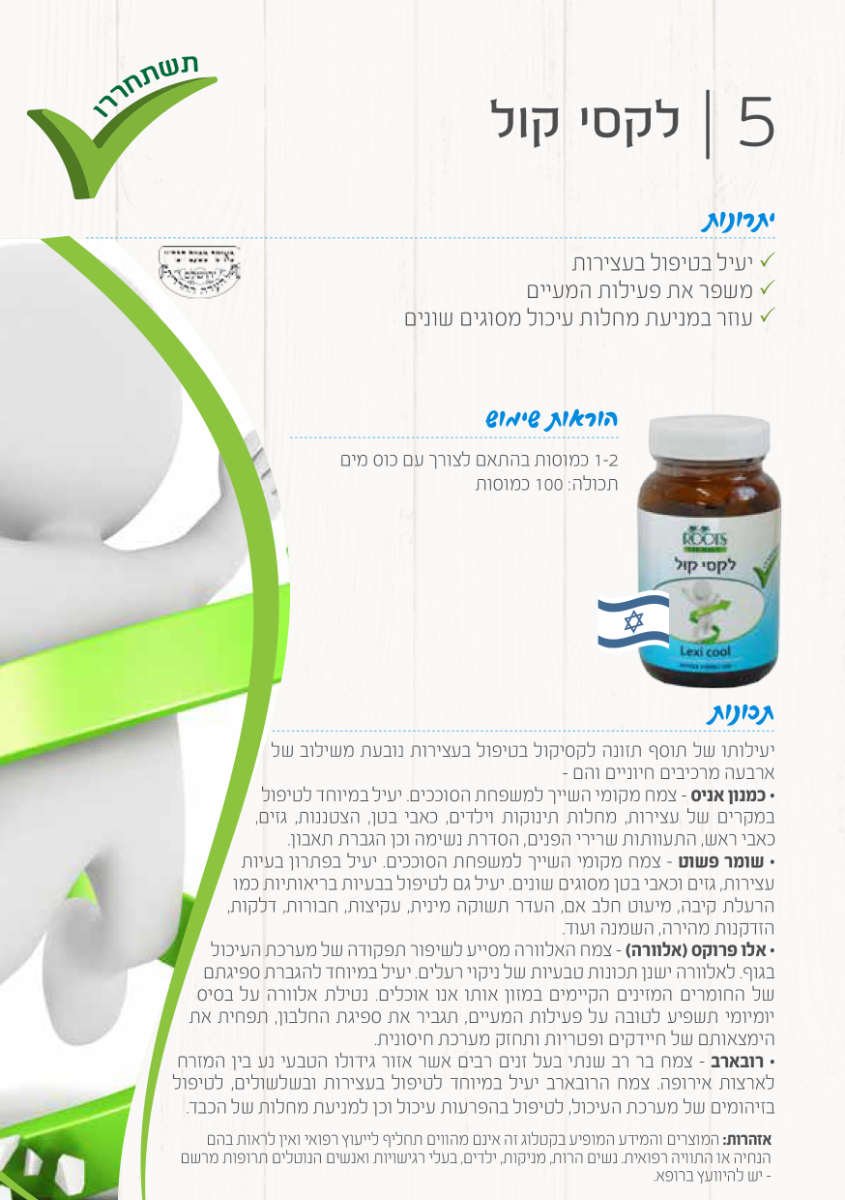 המידע הנכלל באתר ו/או מידע שנמסר ע"י נציגינו הינו מידע לידיעה בלבד ואינו מחליף בשום אופן ייעוץ רפואי. יש להתייעץ עם רופא אם יש לך חששות לגבי השימוש. יובהר כי המוצרים הנזכרים אינם תרופות. אנו ממליצים לנשים בהיריון, מניקות וילדים בפרט להיוועץ ברופא / רוקח לפני השימוש.