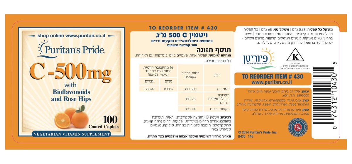 -- ויטמין C 500 -- מאה קפליות ן Puritans Pride